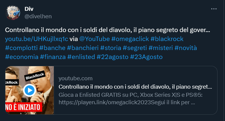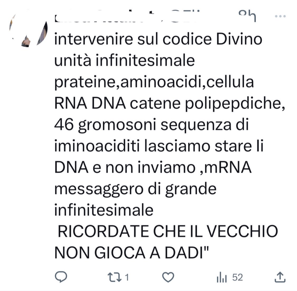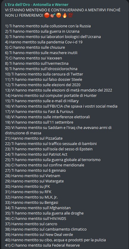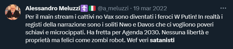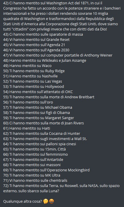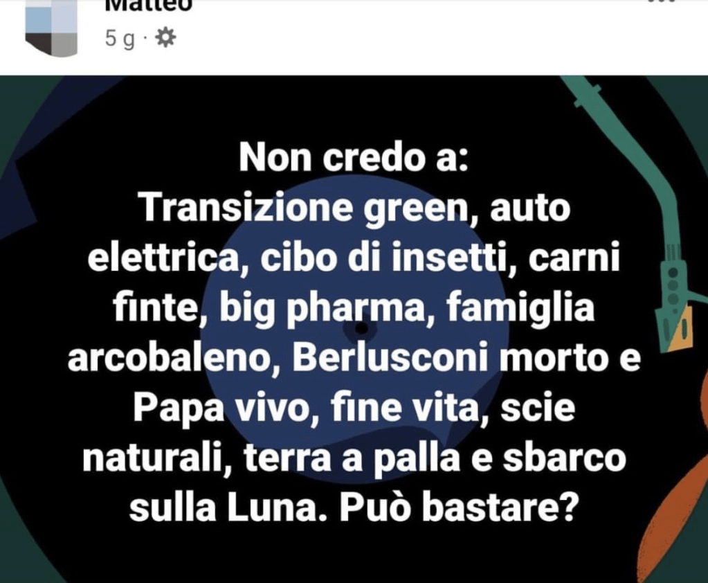 Sebbene il C.E. sia una sorta di jukebox dei complotti che sa di tutto un po’, negli ultimi anni l’argomento che ha catalizzato l’attenzione della specie – e che ne ha fatto crescere consistentemente la popolazione – è stato senza ombra di dubbio il COVID, seguito a ruota da relativi vaccini e provvedimenti politici di varia natura.