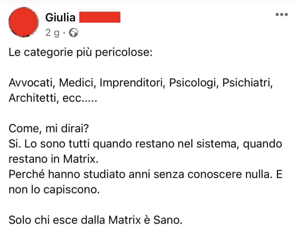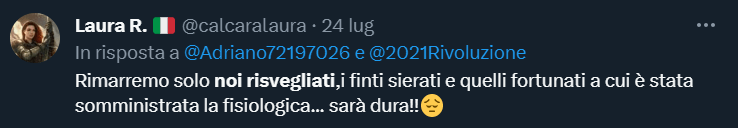 - Risvegliato semplice: è il grado più basso della milizia complottista, il suo compito principale è condividere sui propri canali le rivelazioni dei superiori, nonché entrare in discussioni social di altri utenti scrivendo frasi a caso come “Hai fatto la 30° dose?”, “Sei solo uno schiavo”, “Quanto ti pagano i Rothschild?” e altre perle di saggezza analoghe.