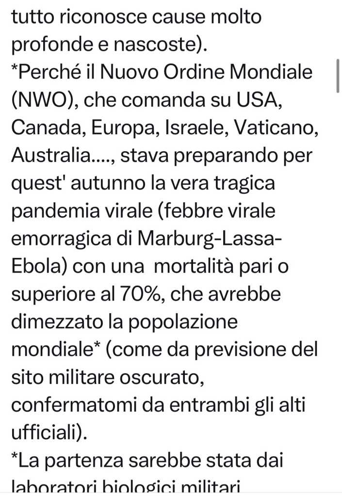 Si intuisce facilmente come, per una specie la cui intera esistenza dipende da avvenimenti tragici e catastrofi mondiali, un virus di provenienza esotica che causa una pandemia improvvisa e costringe i governi di tutto il mondo a quarantene, protocolli di emergenza, provvedimenti anti-affollamento e vaccinazioni di massa sia sostanzialmente la tempesta perfetta; l’El Dorado dell’evangelizzazione complottista.