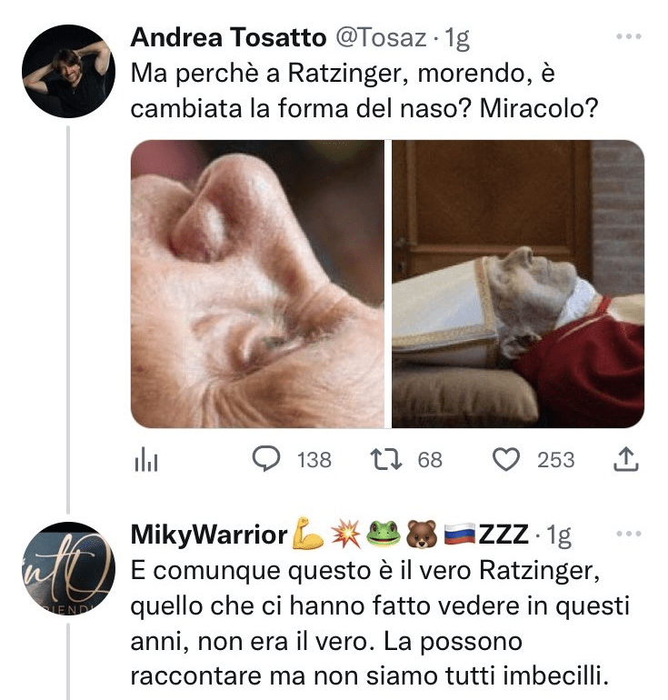 Al netto di piccole variazioni soggettive, però, si può dire che l’apparente feticismo della morte è in realtà uno strumento evangelico che il soggetto sfrutta maggiormente in quanto estremamente comodo da utilizzare: con una brevissima ricerca su Google gli esemplari della specie possono pubblicare ossessivamente notizie di gente vittima di malori, malattie congenite, tumori aggressivi o semplici incidenti stradali e scrivere cose come “il solito malore improvviso”, “e voi ancora ci credete?”, “cominciano a cadere” e altre citazioni dalla discografia inedita di Povia, o in alcuni casi senza aggiungere nulla e affidarsi ai sottintesi.