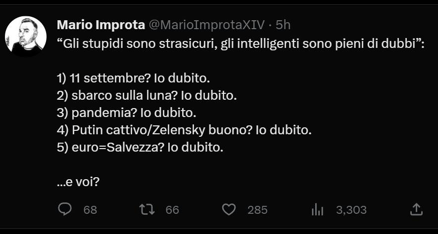 Il soggetto dichiarerà quindi apertamente – nel goffo tentativo di mostrare sinapsi attive e avvalendosi di citazioni celebri che non sa cogliere – di dubitare di tutto, per sottolineare che dubitare sia sintomo di intelligenza e di conseguenza lo siano i suoi dubbi, a prescindere da quali siano. Il problema (forse è più appropriato definirlo paradosso) è che quelli che il C.E. chiama erroneamente dubbi sono in realtà sospetti. Al di là della differenza lessicale, è il pregiudizio di partenza riguardo al mondo esterno che determina i sospetti del soggetto e perciò, quand’anche uno di questi sospetti si rivelasse legittimo, il C.E. non potrebbe vantarlo come prova di brillante intelletto; perché se dubitare è sintomo di intelligenza, dubitare di ogni cosa è sintomo di ignoranza, ma tutto questo Improta non lo sa.