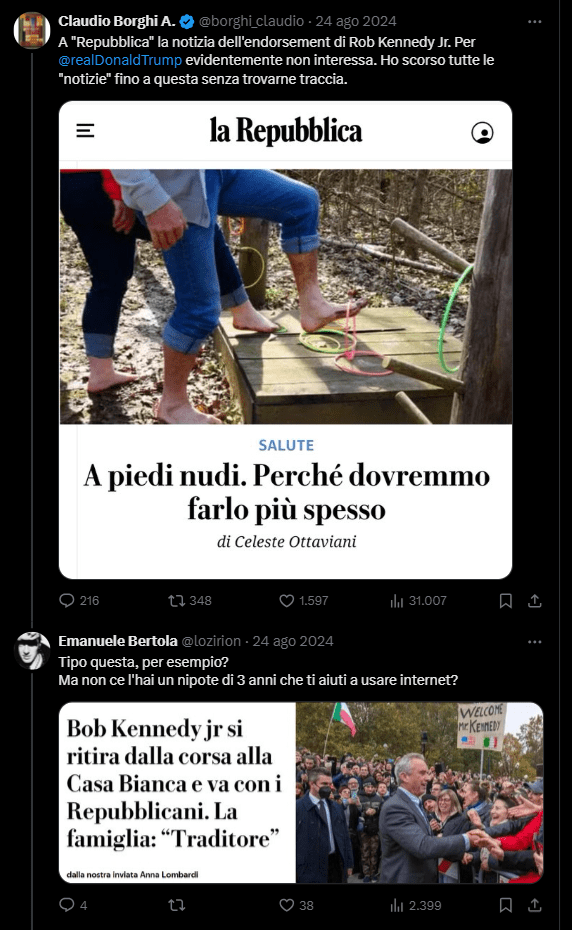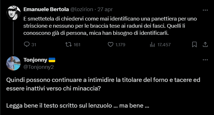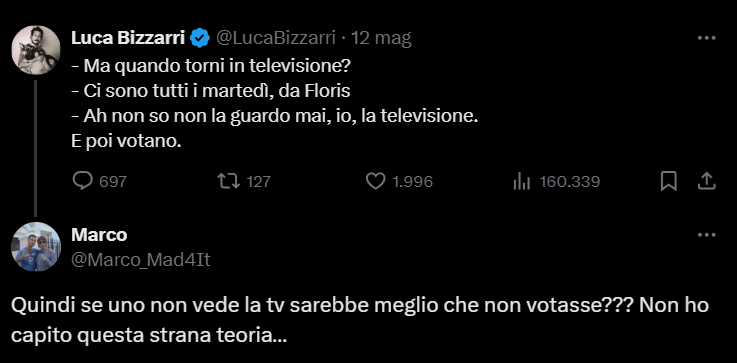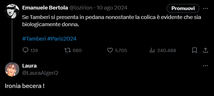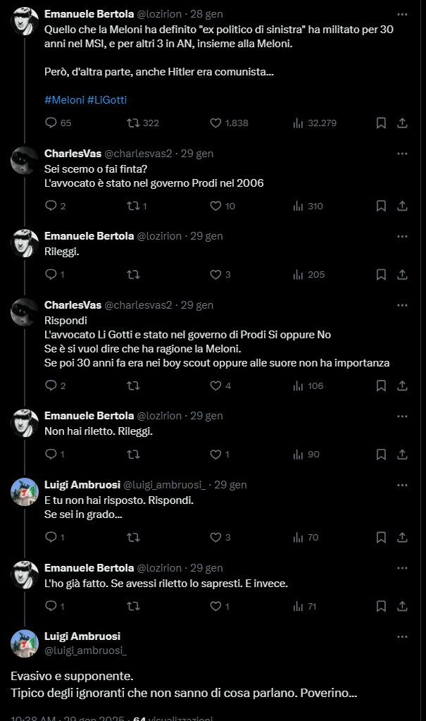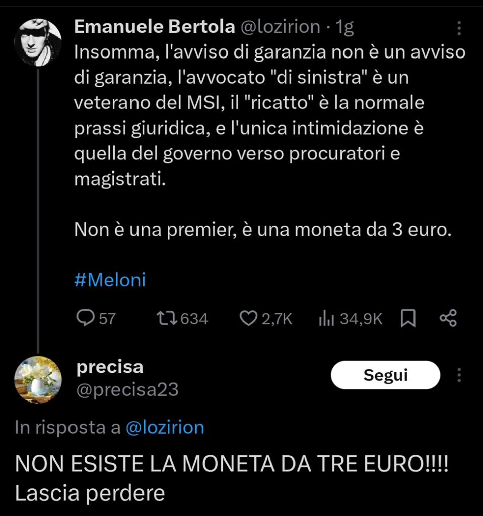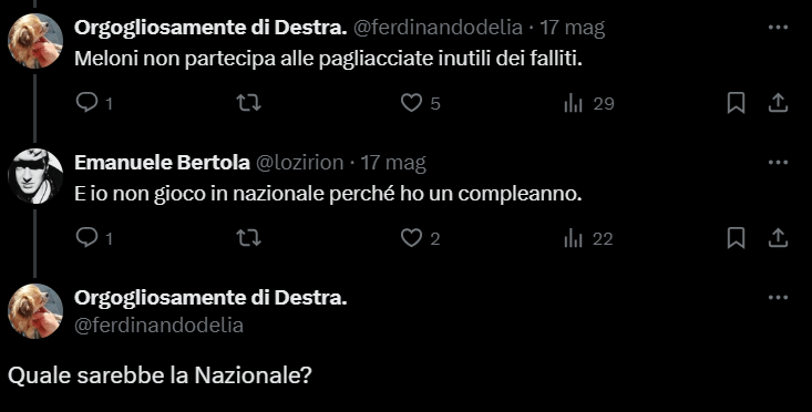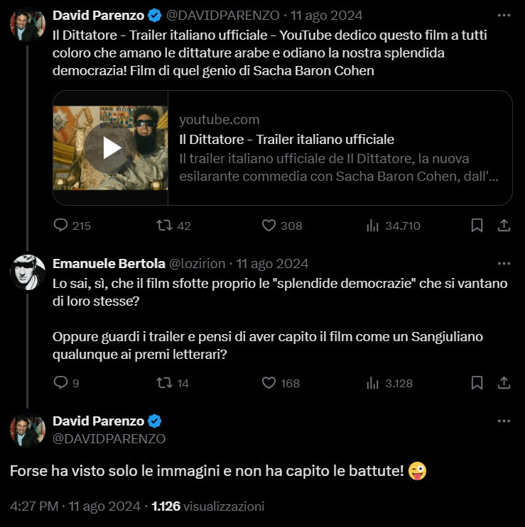 Il T.D. – come ogni individuo totalmente avulso da ironia e percezione del contesto – sui social prende tutto con estrema seriosità, che si tratti di un’inchiesta sulla tratta di schiavi dal Botswana o del dissing tra Tony Effe e Marco Columbro. Ne consegue la mala gestione tanto di ciò che non è serio quanto di ciò che, seppur serio, viene esorcizzato con leve comiche. Non sapendo gestire i diversi registri di espressione, interverrà a gamba tesa su qualsiasi questione, con la confidenza e la serenità di Giovanardi a un after party in casa di Malgioglio.