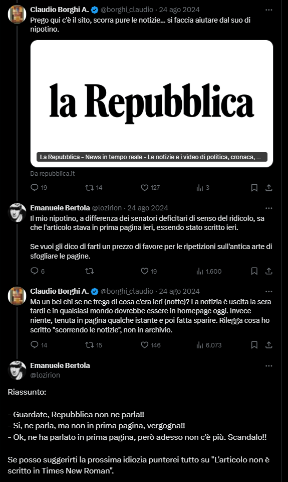 La diffusione capillare e il trasformismo, forse più degli altri aspetti che abbiamo analizzato fin qui, sono sicuramente ciò che più identifica le potenzialità colonizzatrici della specie in un contesto a lunghissimo termine. Se già ora è praticamente impossibile essere al riparo dai Travisatori Didascalici, va chiarito che trasformarsi in essi è più facile di quanto si possa pensare. L’approccio esasperato agli argomenti è qualcosa che ribolle nel sottobosco dei social, e ognuno di noi ha temi che lo colpiscono più di altri, rispetto ai quali è facile cedere ad una comprensibile perdita di lucidità. Se però da tali perdite di lucidità ci si inizia ad autoassolvere (magari cedendo alla solidarietà della propria bolla anche quando la si è fatta fuori dal vaso) si rischia di ritrovarsi, senza nemmeno rendersene conto, a ragionare come senatori leghisti in preda al complottismo.
