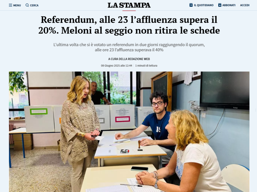 Dopo le visioni mistiche del Crescentini, passiamo a una categoria strettamente tecnica, ma ugualmente meritevole. Il Batrace D’Oro per la categoria Satira d’impatto va a… La Stampa! Nel racconto in tempo reale del voto, unendo la frenesia da breaking news con il bisogno di engagement sui social, La Stampa titola sui numeri bassi dell’affluenza apponendo in primo piano l’immagine della premier al seggio, ovvero l’unica persona che è entrata al seggio senza fare affluenza. Un tocco di classe di cui gli amanti dei sottintesi e del nonsense avevano davvero bisogno, ora che Adinolfi è impegnato in Honduras.