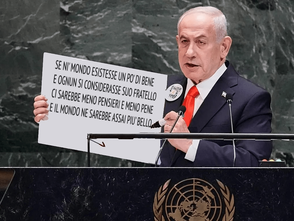 È giunto il momento più delicato della serata, e mi preme ricordare – soprattutto al vincitore – che questa è satira, non serve rispondere al fuoco. Vince il Batrace D’Oro… Benjamin Netanyahu! La sua performance visiva all’assemblea ONU è la dimostrazione plastica, se mai ce ne fosse ulteriore bisogno, che il più lucido osservatore del mondo oggi è Maccio Capatonda. Al suo ingresso la sala si svuota come nemmeno un ascensore dopo una scoreggia, ma Bibi, novello Fernandello, prosegue imperterrito nel tentativo di diventare come Billy Ballo: estrae cartelli insulsi e li sventola mentre si compie un massacro, con la mitomania della valletta del pugilato, ma senza le tette a dare un senso alla sua esistenza.