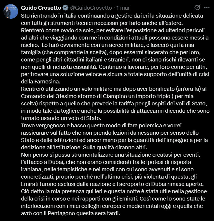 Ci spostiamo ora sul sempre accidentato terreno della excusatio non petita per una premiazione meno tecnica e più guascona. Vince il Batrace D’Oro… Guido Crosetto! Il ministro della difesa, ignaro della guerra e di stanza a Dubai per il buffet, si ritrova coi droni in tinello; preso alla sprovvista, lascia un cannolo a metà, corre ai ripari e poi… Poi va su Twitter, come uno Schettini qualunque, a spiegare che tornerà con un aereo dell’esercito ma ha chiesto di pagare di tasca propria – e mica solo il costo del viaggio, macché; paga il triplo e lascia pure la mancia al Tenente – perché non accetta lezioni di senso dello stato da nessuno, lui che ha lasciato là la sua famiglia ed è stato anche azzurro di sci. Naturalmente, nessuna questione di costi o uso illegittimo è stata sollevata, giacché nessun essere senziente potrebbe obiettare su un ministro della difesa in pericolo scortato da un aereo militare; ma è qui, il grande Bardo direbbe, che c’è l’inghippo. I più distratti diranno che il tweet voleva sedare polemiche, ma non è così: serviva invece a delegittimare eventuali attenuanti. Sotto le bombe a Dubai non avvisato e col cannolo a metà, Crosetto non ha colpe; è solo l’uomo giusto nel posto sbagliato. Ridicolo, sì, ma non necessariamente comico. Vergando il tweet mentre i missili gli fischiano sul bidet, viceversa, il Lurch di Via della Scrofa ribadisce i propri meriti comici oltre le fortuite coincidenze, la tocca con la mano de Dios al limite dell’area piccola e va ad intestarsi il Batrace in solitaria, col sussulto del vero fuoriclasse.